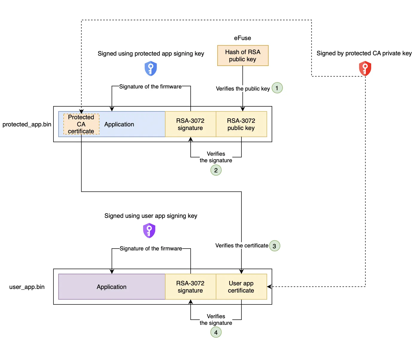 As previously mentioned, both of these apps can be developed independently so the ownership of these apps can be with different entities. This could mean that both of these apps require separate signing keys. For verifying the protected app, we burn the hash of the protected app public key in eFuse. While we can do the same for the user app public key, it is not scaleable as eFuse memory is scarce.