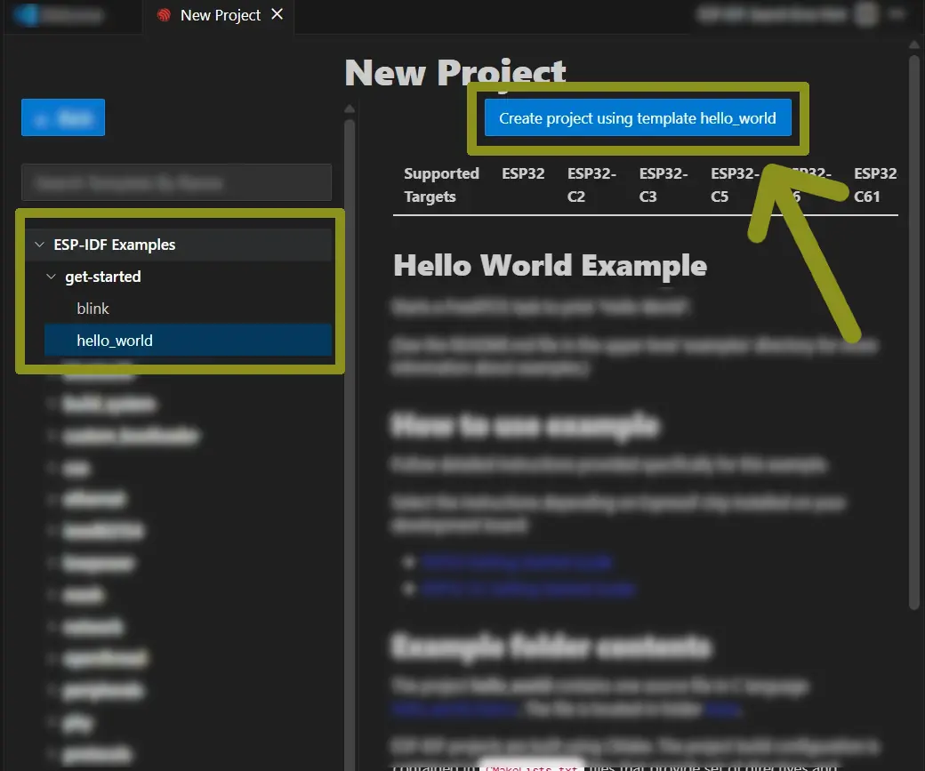 Now that the extension and toolchain are installed, it’s time to test building a project. We’ll create a new project based on one of the examples included with the ESP-IDF toolchain.