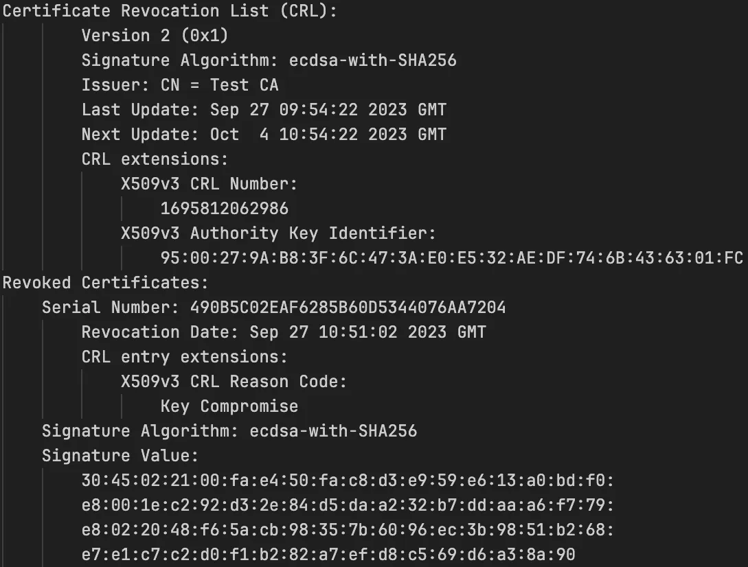 In the above CRL, the certificate with serial number “490B5C02EAF6285B60D5344076AA7204” is revoked because of “Key Compromise”, where the serial number acts as a unique identifier for the certificate the CA issued.