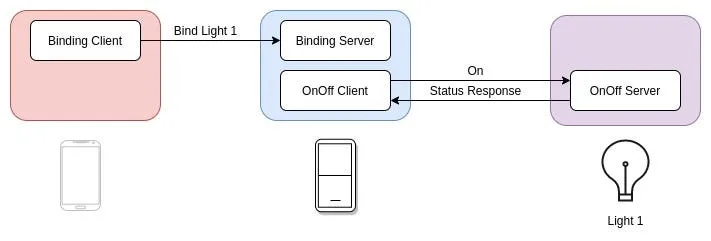 Let’s go back to our example of the switch controlling the light that is shown above. For this, the switch additionally needs to have a Binding cluster server that offers the binding service. After a user binds the light to the switch, an action (on or off) on the switch results into corresponding action on the light. This scenario is illustrated below: