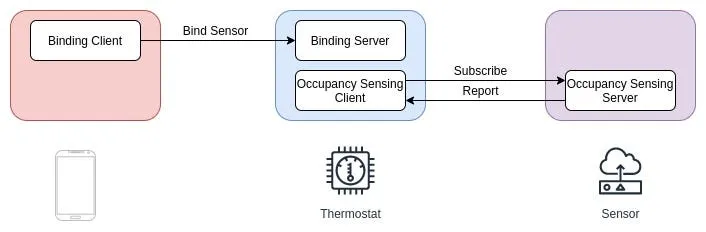 The thermostat and occupancy sensor usecase mentioned above can be realised after the thermostat subscribes to attributes of the sensor. First the user binds the thermostat to the occupancy sensor. Once done, the thermostat can subscribe to the sensor attributes and receive data periodically as well as when there is an activity (change in sensor attributes). This scenario is illustrated below: