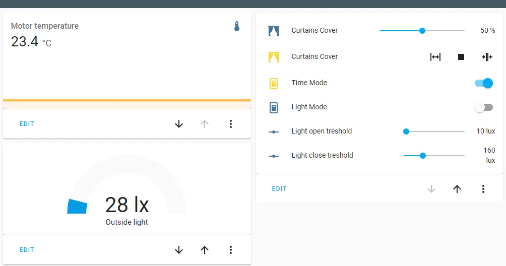 Home Assistant provides friendly GUI, where the user can change and set values of desired modes. When the whole system is fully initialized, there is an asynchronous function callback, that process an incoming message and based on the topic changes the relevant values. The program cycles in an infinite loop and processes the position of the curtains based on the active mode, sensor values and actual position. It also reads new sensor data every 15 seconds, which is sent to the server.