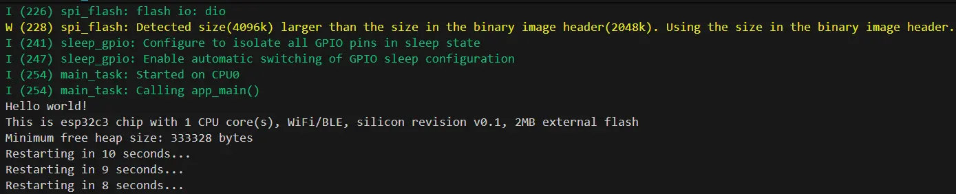 If you see the message in the terminal, your setup is working correctly and you’re ready for the workshop and to start developing projects based on ESP-IDF.
