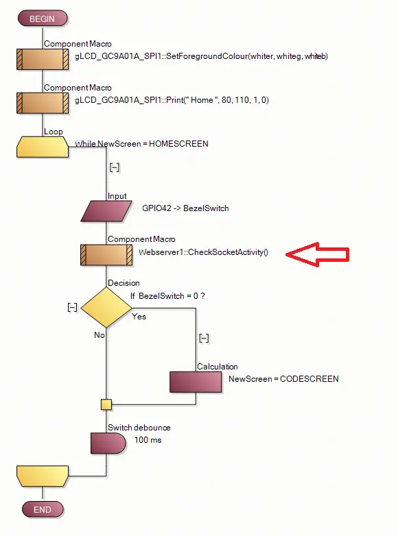 The next thing we need to do is periodically check the Web connection to see if a page has been requested. We do this by putting a CheckSocketActivity() command in the loop on each screen macro as you can see here: